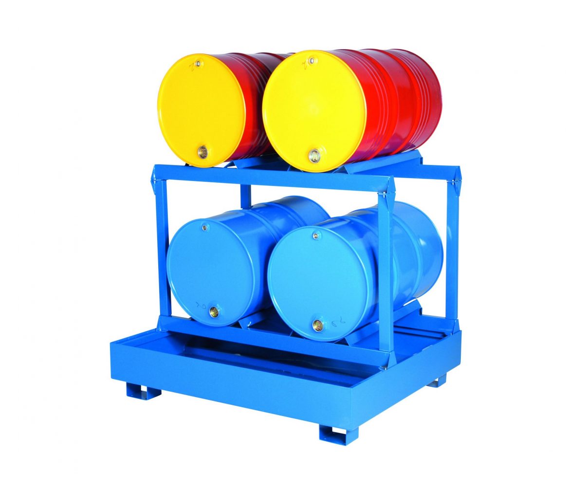 Fatställning i kraftig lackerad stålplåt med plats för 4 liggande fat. Fatet ligger i medlut för att enkel tömning/ avtappning. Flyttas enkelt med gaffelvagn eller truck.