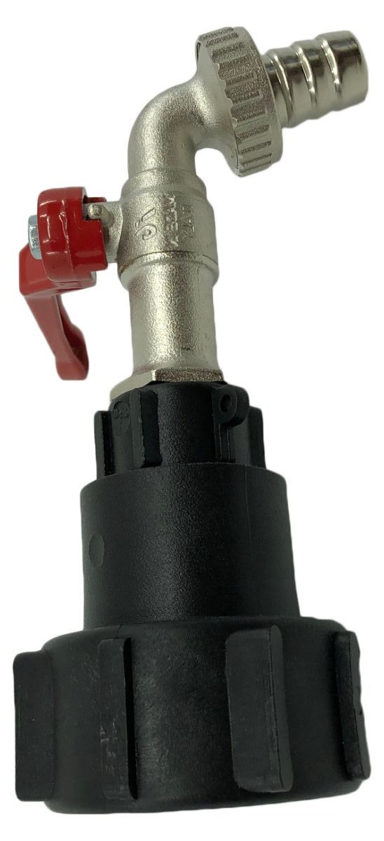 IBC-adapter i glasfiberarmerad plast med svängtapp/ svivel. Tappkran med hus av förnicklad mässing, kula av förkromad mässing. Handtag av aluminium. Slanganslutning 3/4".Share