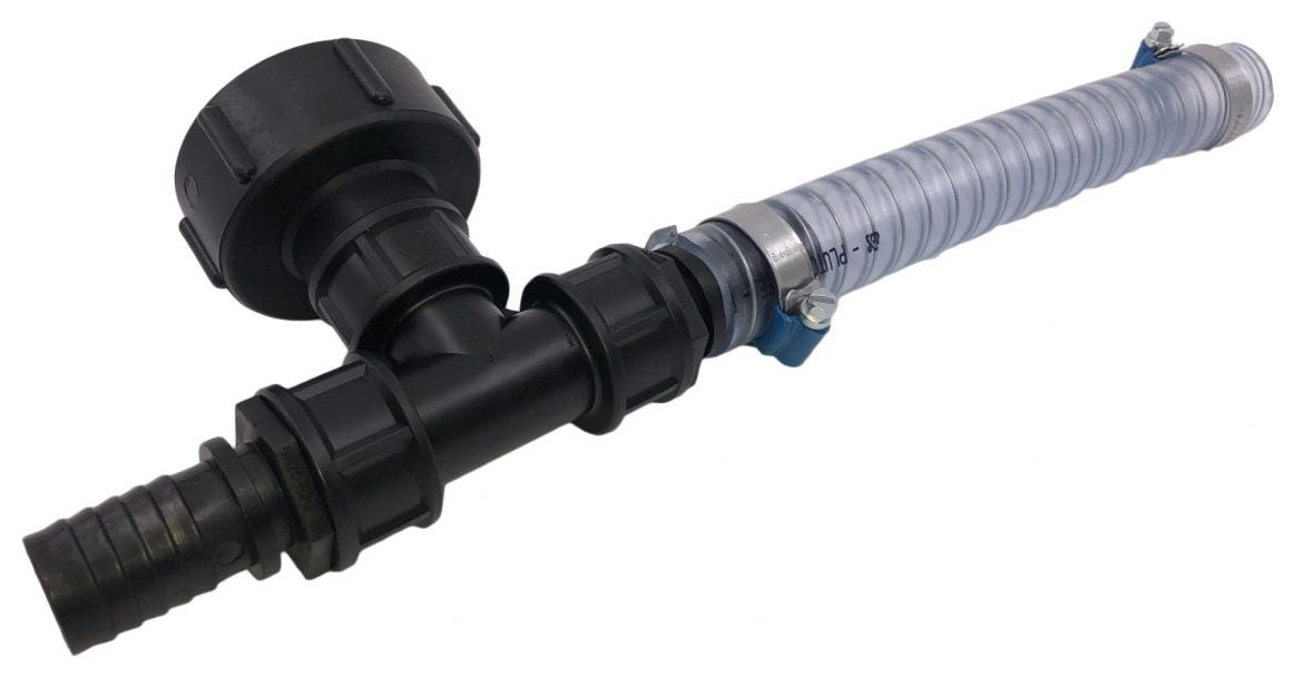 Med denna tankanslutning kan du koppla vidare på vårt sammankopplingsset för 2 IBC-behållare. Strukturen kan göras ovanpå varandra eller sida vid sida. Kopplingen består av 1 meter spiralslang av PVC. 50 mm. 2 st. slangklämmor, 1 st. T-koppling, 2 st slangnippel 2", 1 st adaptrar 60x6 med inv. gänga 2".